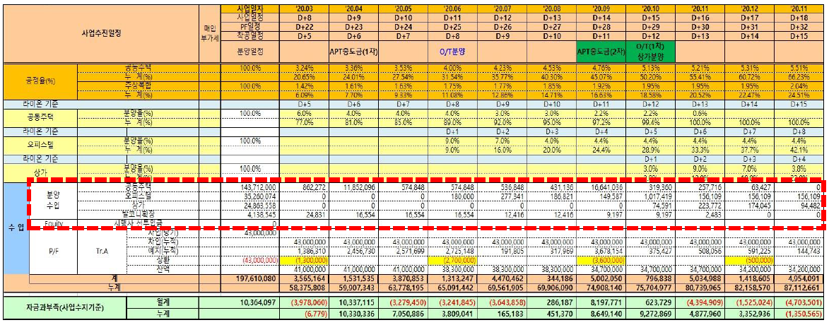 중도금 4회 차 납입일은 공정률 50% 이후 지정중도금 납입일자에 따라 현금 흐름표상의 현금 유입 및 유출의 편차가 매우 큼 에쿼티 투입일 및 금융조달액 (PL, BL, PF) 기표일에 금액 반영
