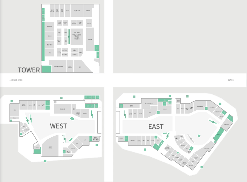 타워존, WEST존, EAST존 이렇게 세가지 구역으로 나뉘어있지만 건물과 건물사이에 다리가 있어 이동하는 데는 편하게 되어 있습니다.