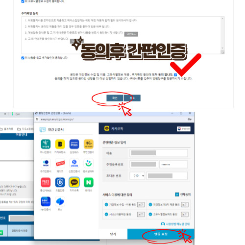 저는 간편 인증을 선택하였습니다. 인적사항 기입 후 동의 간편 인증